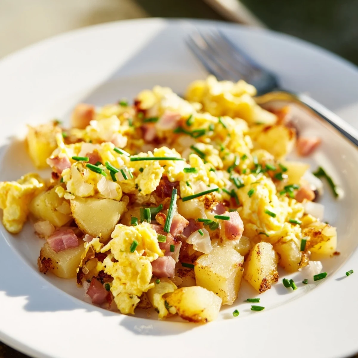 Merken Das Farmerfrühstück ist eine herzhafte deutsche Pfanne mit knusprigen Kartoffeln, Eiern, Schinken und Zwiebeln – perfekt für ein sättigendes Frühstück oder Brunch.