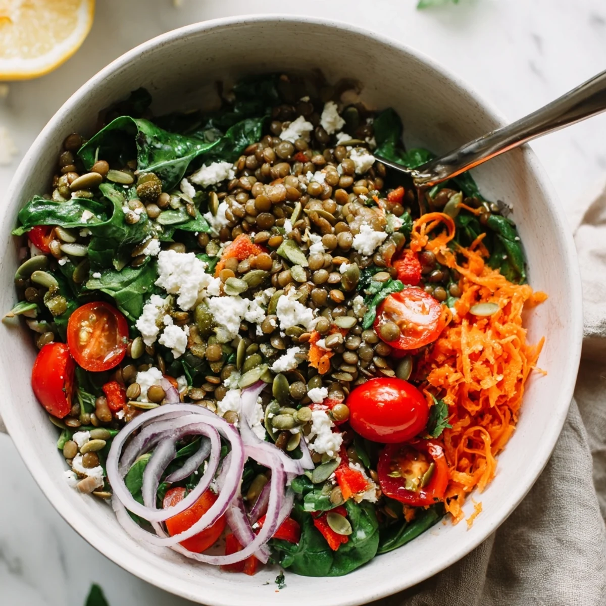 Eine nahrhafte, farbenfrohe Bowl voller proteinreicher Linsen, frischem Gemüse und Spinat—das perfekte Gericht für einen gesunden Energieschub zu jeder Tageszeit.